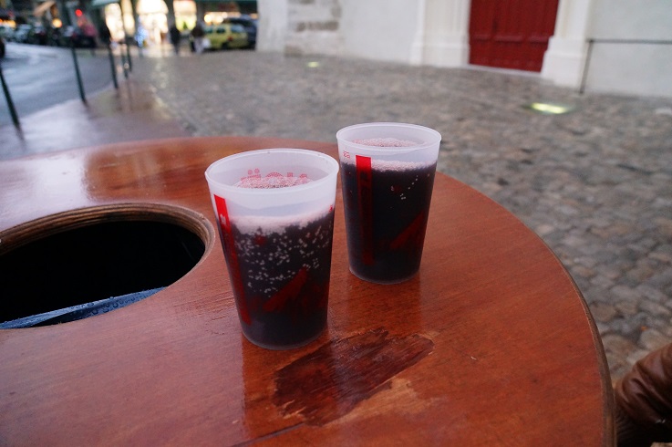 時期的にクリスマスマーケットをやっていたので、そこでホットワインやチュロスを頂きました。