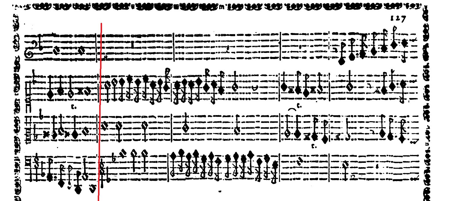 この曲集にはメインは鍵盤用の作品集で、ハープのための作品もこの他にいくつか含まれているのですが、全てこの総譜の形で4声が書き分けられています。