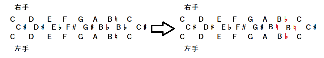 どういうことかというと、上から見た弦の図で表すとこんな感じ。。。右側がB♮を外側にした調弦。左側がB♭を外側にした調弦。