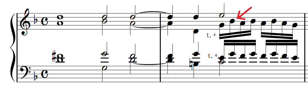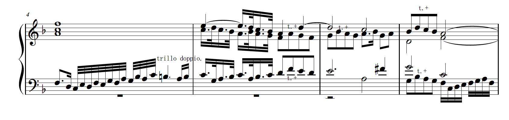 楽譜作成ソフトだとこんなおしゃれな表示が見つからなかったので、t.のとなりに+で書いていますが、この印がある下のようなところでは、音が全部かかれていなくてもこのタイプのトリッロをしてくださいね。と書いています。