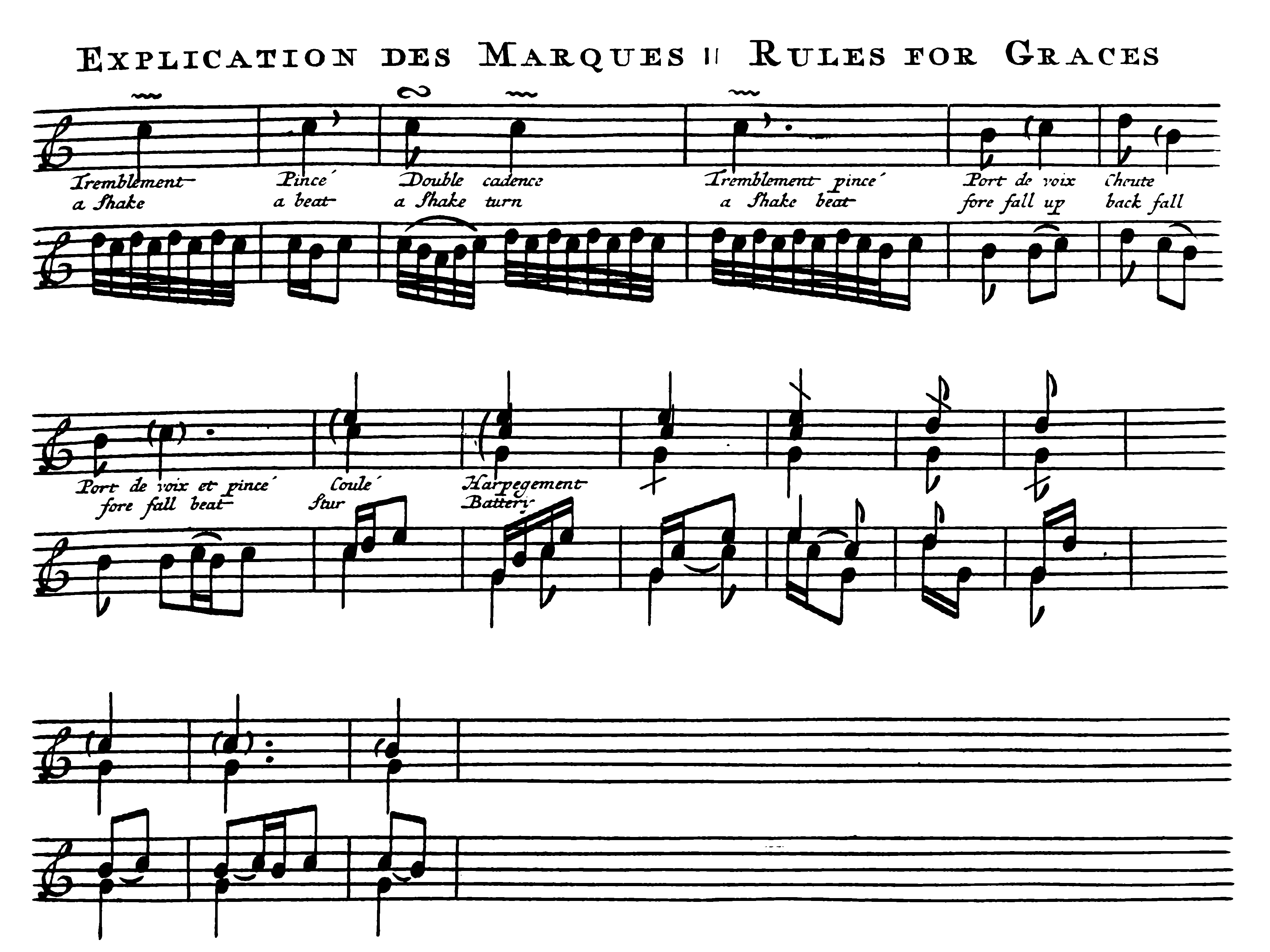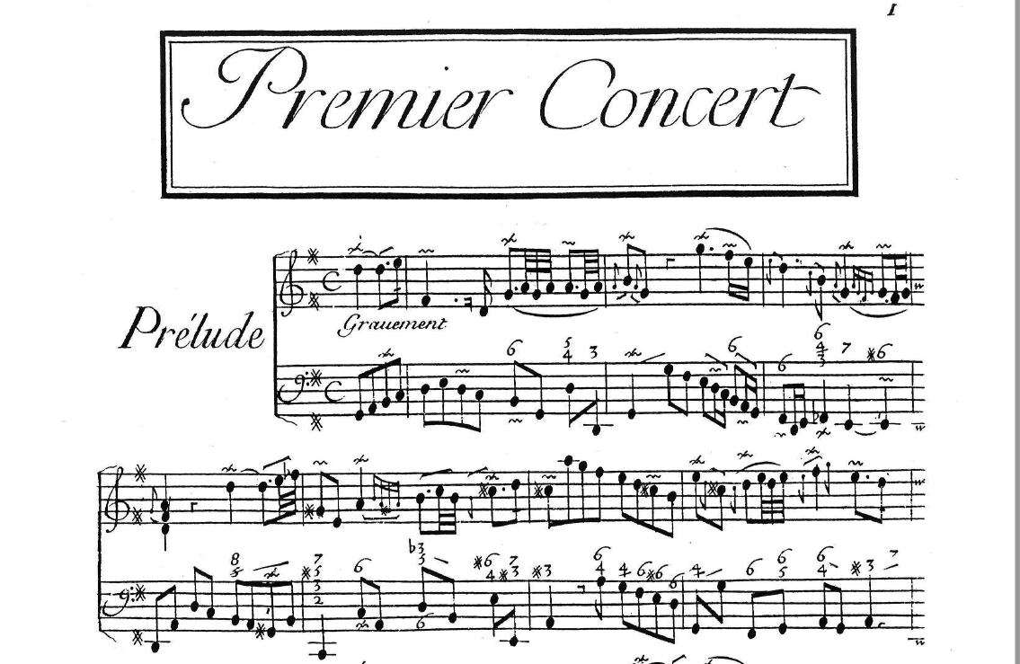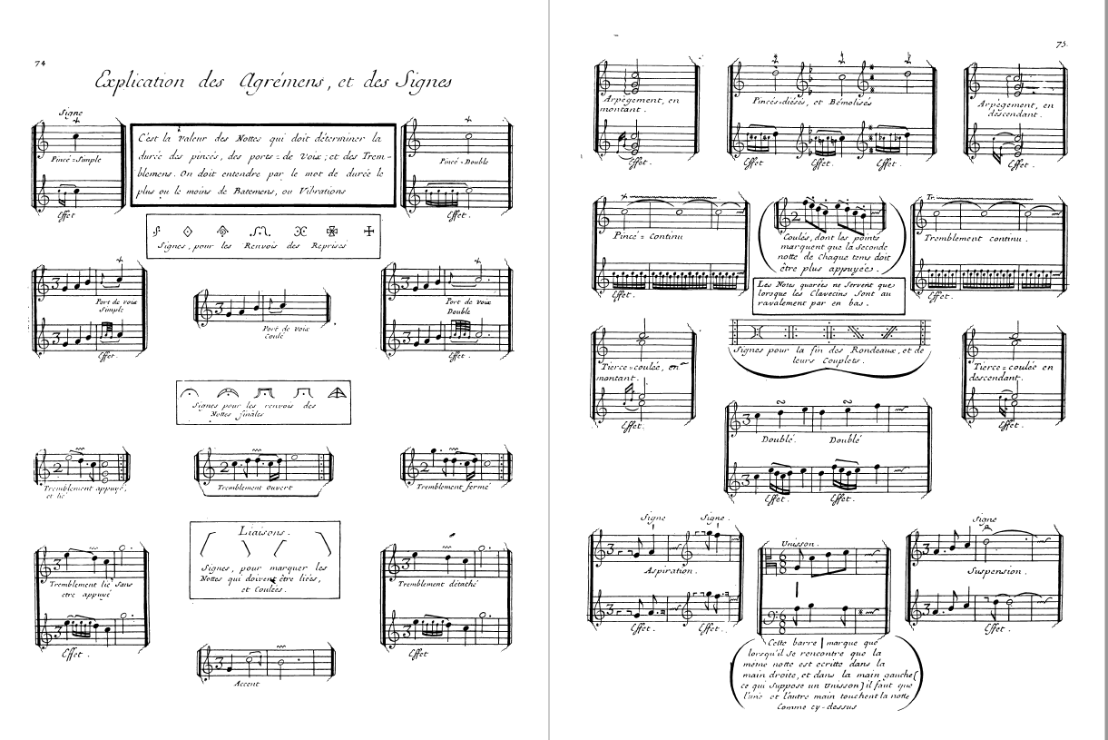 また、F.クープランの2つのコンセール集(1722&1724)はどちらも、あらゆる楽器で演奏できるように書かれており、クラヴサン曲と同じ装飾音を用いて高音楽器声部、バス声部が書かれています。