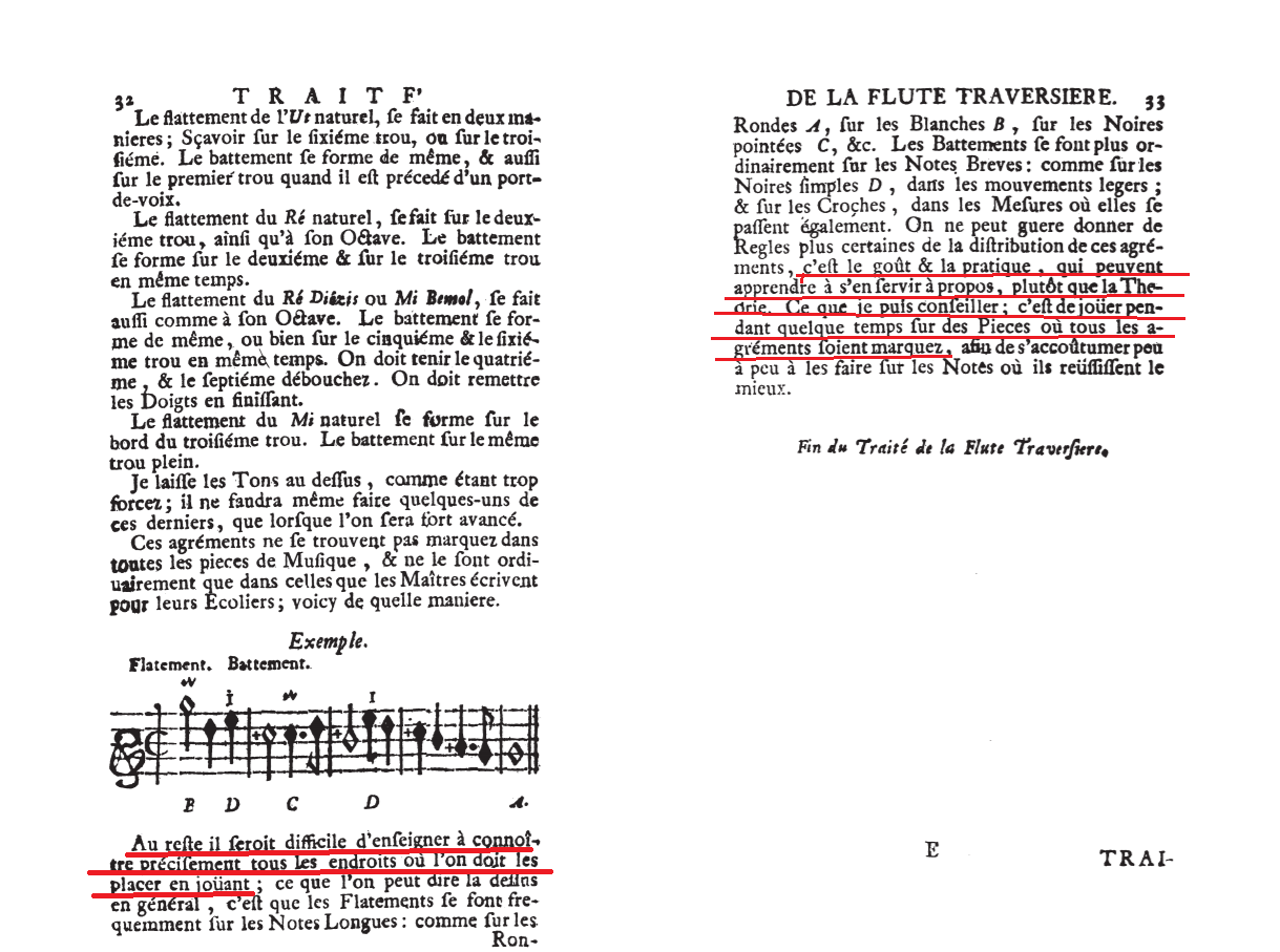 例えばJ.-M.オトテールは1707年に出版された自身の教則本「横笛、縦笛、オーボエの基礎Principes de la flûte traversière, de la flûte à bec, et du haut-bois」で