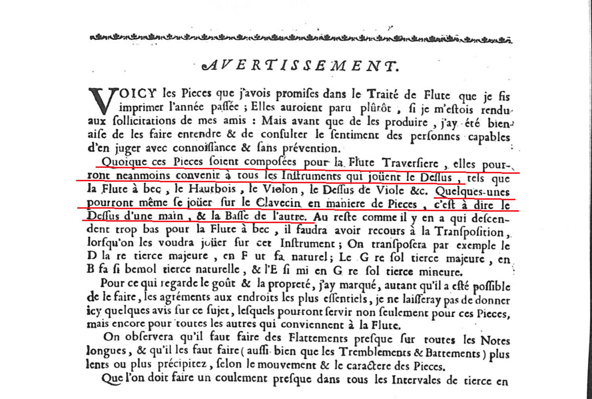 「フルート用に書いたけど、どの楽器で弾いても良いよ…いくつかはクラヴサンで弾いても良いけど、その時は片手で高音声部、もう片方で低音声部を弾いてね(要約)」と書いています。