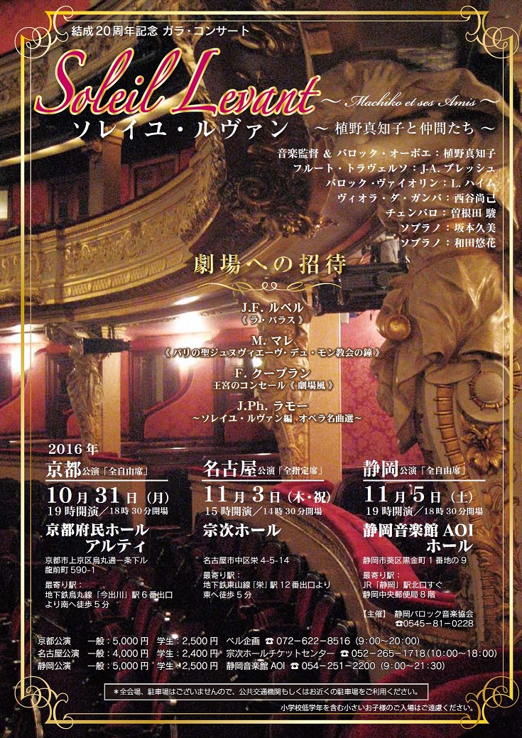 出演=植野真知子(音楽監督&バロック・オーボエ)、ジャック=アントワーヌ・ブレッシュ(フルート・トラヴェルソ)、リヴ・ハイム(バロック・ヴァイオリン)、西谷尚己(ヴィオラ・ダ・ガンバ)、曽根田駿(チェンバロ)、坂本久美(ソプラノ)、和田悠花(ソプラノ)
