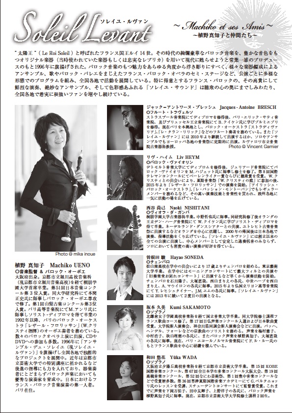 ーソレイユ・ルヴァンは、太陽王( Le Roi Soleil)と呼ばれたフランス国王ルイ14世。その時代の絢爛豪華なバロック音楽を、豊かな音色をもつピリオド楽器を用いて現代に甦らせようと1996年に設立されました。ー