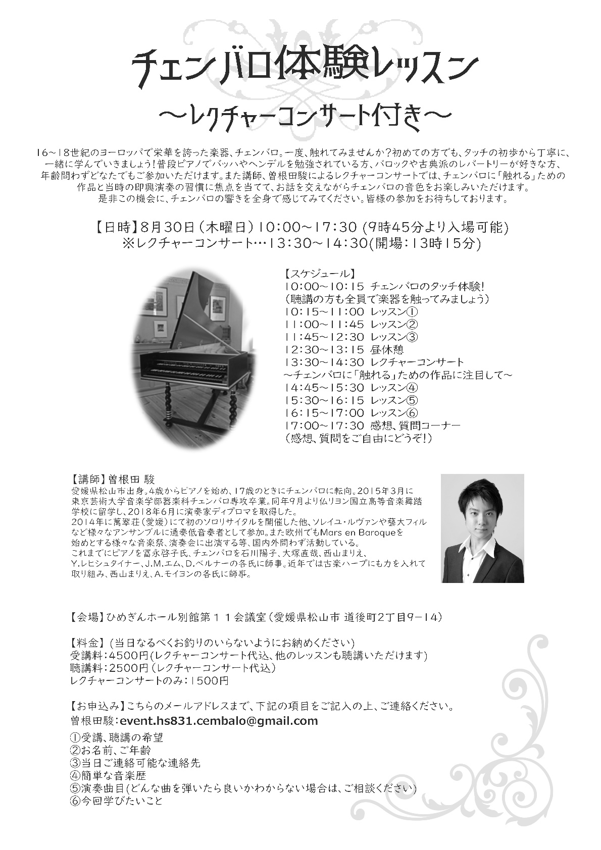 今年の夏に松山でチェンバロの体験レッスンを実施いたします。