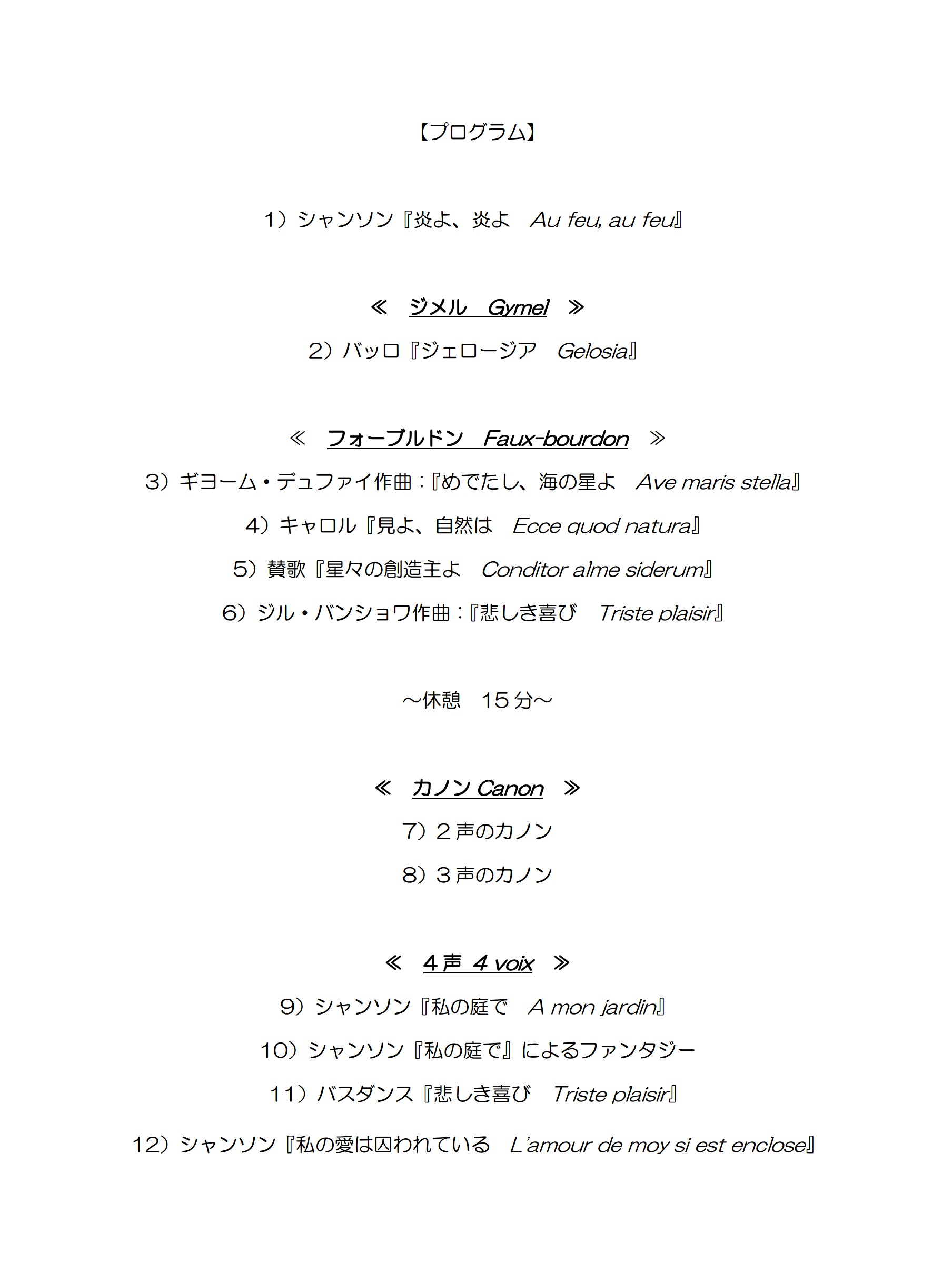 プログラムは全部で12曲でしたが、完全な形で書かれているものはジル・バンショワの作品1曲だけに留めて、あとはカノンを作ったり、バイユー手稿のシャンソン、聖歌、M.ドートリッシュのバスダンス、G.エブレオの舞踏教本に入っている旋律への作曲&即興したりという形で演奏しました。