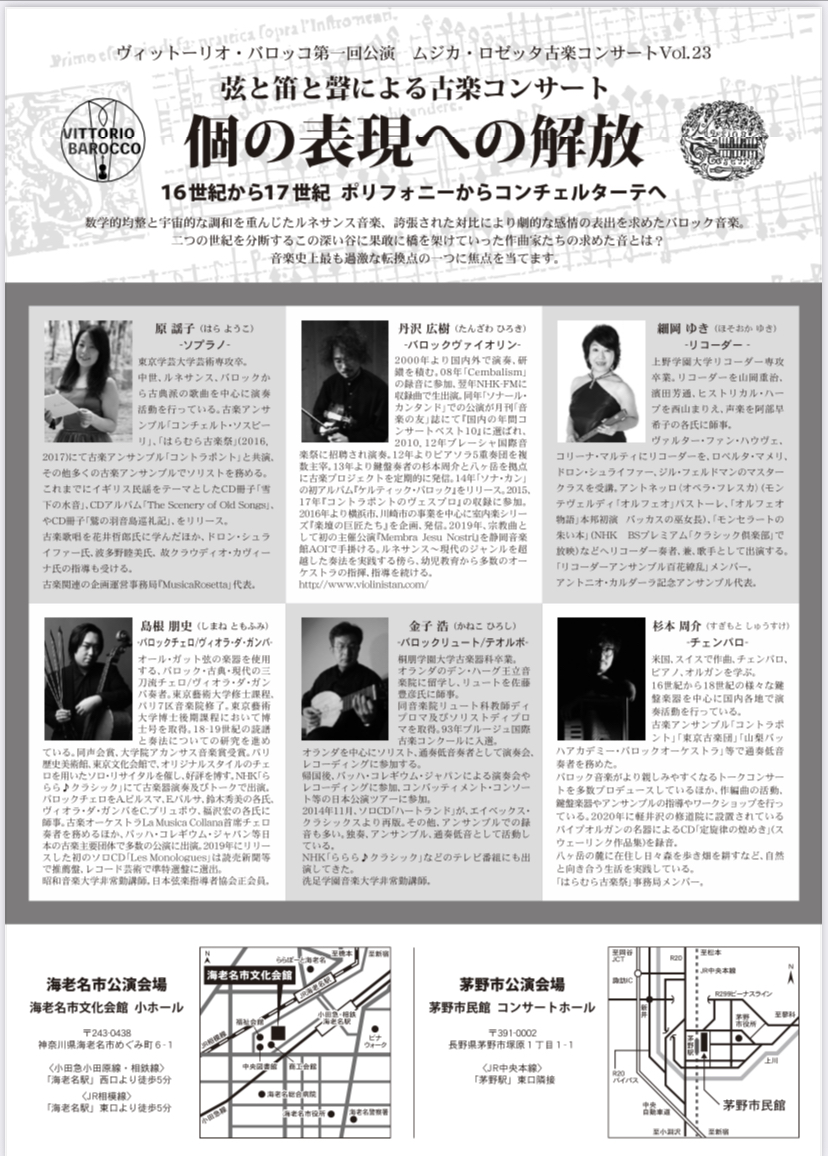 昨年の第1回に引き続きリコーダー奏者の桐畑奈央さん、新しくファゴットの祖先にあたるドゥルツィアン奏者として長谷川太郎さんに出演していただきます。