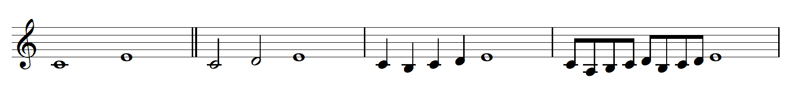 例えば全音符でド→ミという音の並びがあったら、ドの時間の長さを2つ、4つ、8つにわけるとこんな感じの装飾が考えられます。