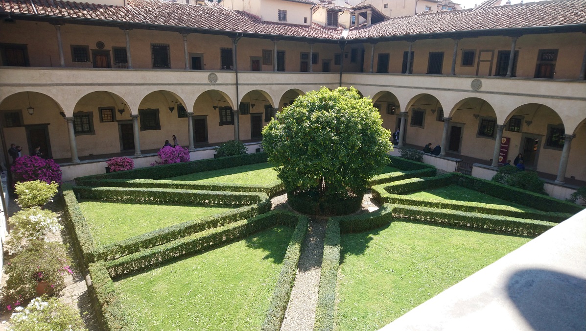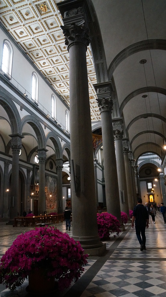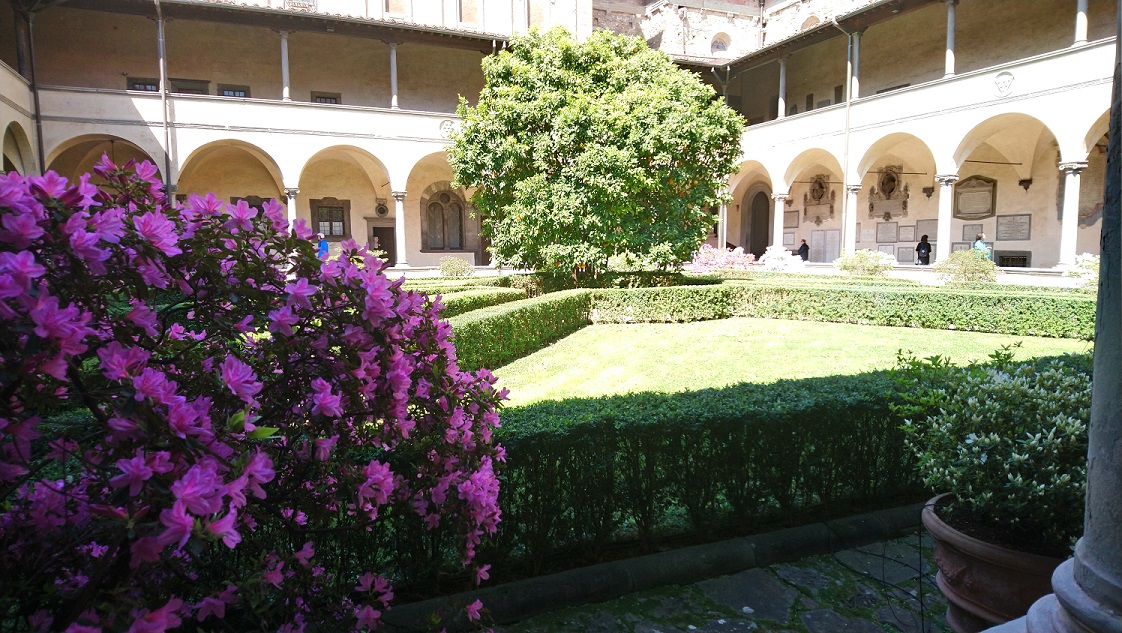 聖堂への入場、付属のラウレンツィアーナ図書館Biblioteca Medicea-Laurenzianaはそれぞれ別で料金がかかりますがここの回廊はとても綺麗でした。この季節は花が咲いて、回廊も教会内も可愛く彩ってくれています。