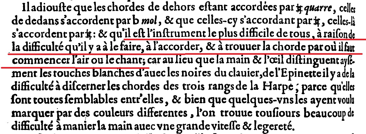 イタリアで生まれたこのタイプの楽器は、フランスにも渡りました。M.メルセンヌは1636年に出版された『宇宙の調和Hamonie universelle』第4巻でこの3列弦のハープ(Harpe à trois rang)を紹介していますが、イタリアからもたらされたことや、オラツィオ・ミッキ(メルセンヌはHorace Michiaと書いていますが、Orazio Michiと同一人物)という名手がいたということを書いた後、加えて、