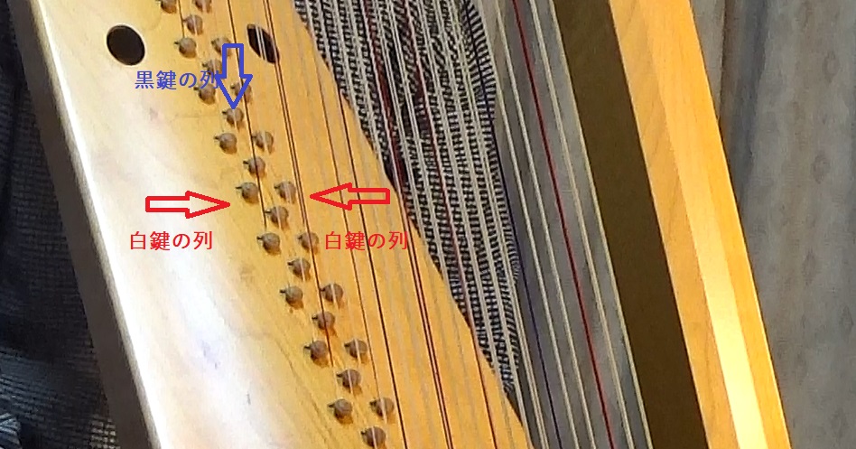 ガット弦(羊の腸が材料)が3列張られていて、両サイドがピアノの白鍵にあたる弦、ドレミファソラシドの音が並び、真ん中に黒鍵に当たる#や♭の弦が並んでいます。曲によっては、一部の音の配置を入れ替える必要がありますが(例えばシの♮と♭を内側と外側で入れ替えるとか)、一応鍵盤楽器と同じ音が全て楽器には揃っています。