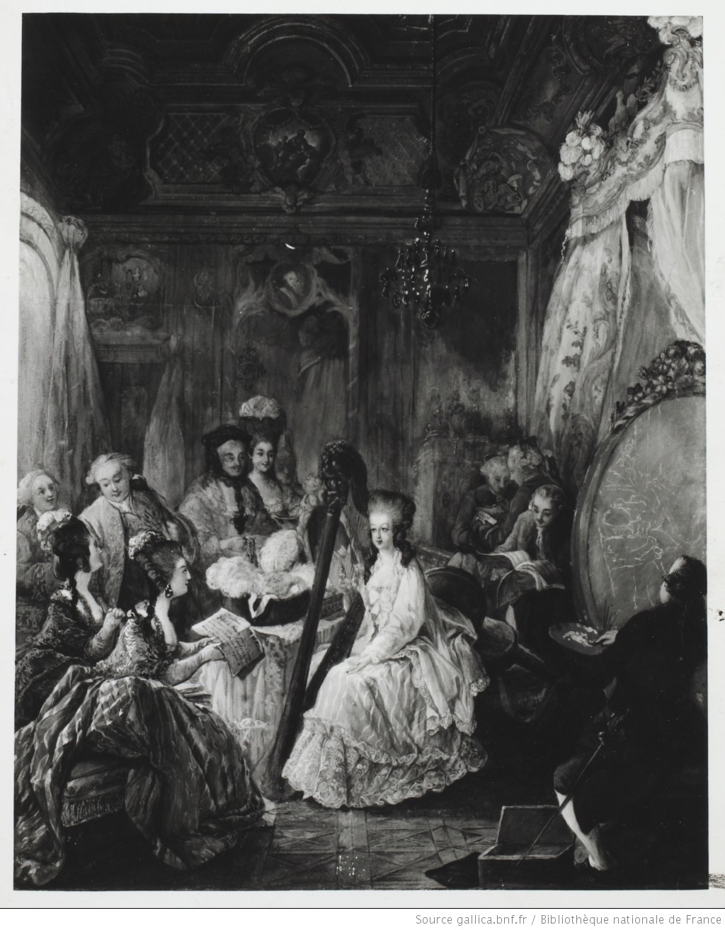 (J.B.ゴーティエ・ダゴティJean-Baptiste Gauthier-Dagoty:「ハープを弾くマリー・アントワネット」1775年)※カラーのものは検索すれば多分沢山出てきます!