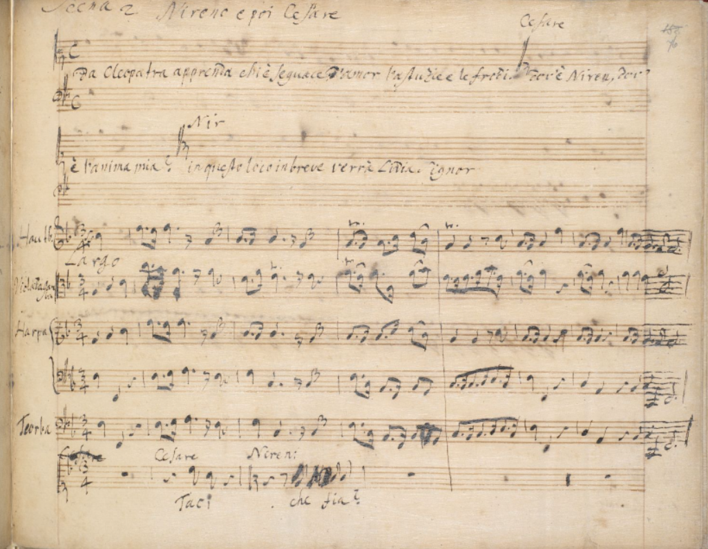 「ジュリオ・チェーザレ」1723年の手稿からハープの入ったシンフォニア。スコア全体はこちらから見れます→British Libraryのページ
